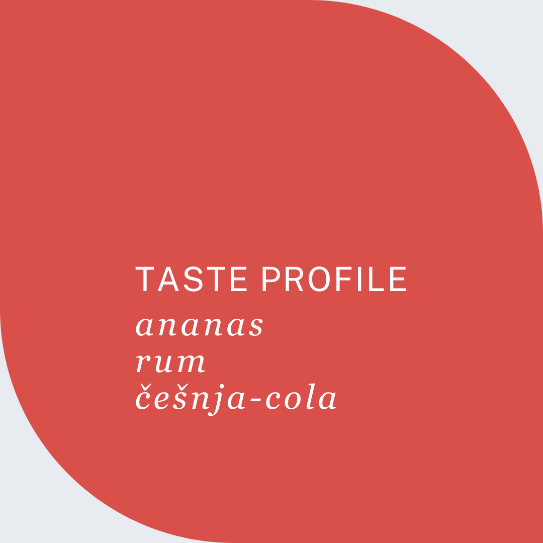 Pričakujte pravo senzorično popotovanje – v prvem požirku vas osveži izrazita nota ananasa in sočnega kivija, ki se elegantno prelivata v sladkasto aromo rdeče češnje in ruma. Zaključek dopolnjujeta temna čokolada in subtilna vanilja, ki ustvarita dolgotrajen in zaokrožen pookus.